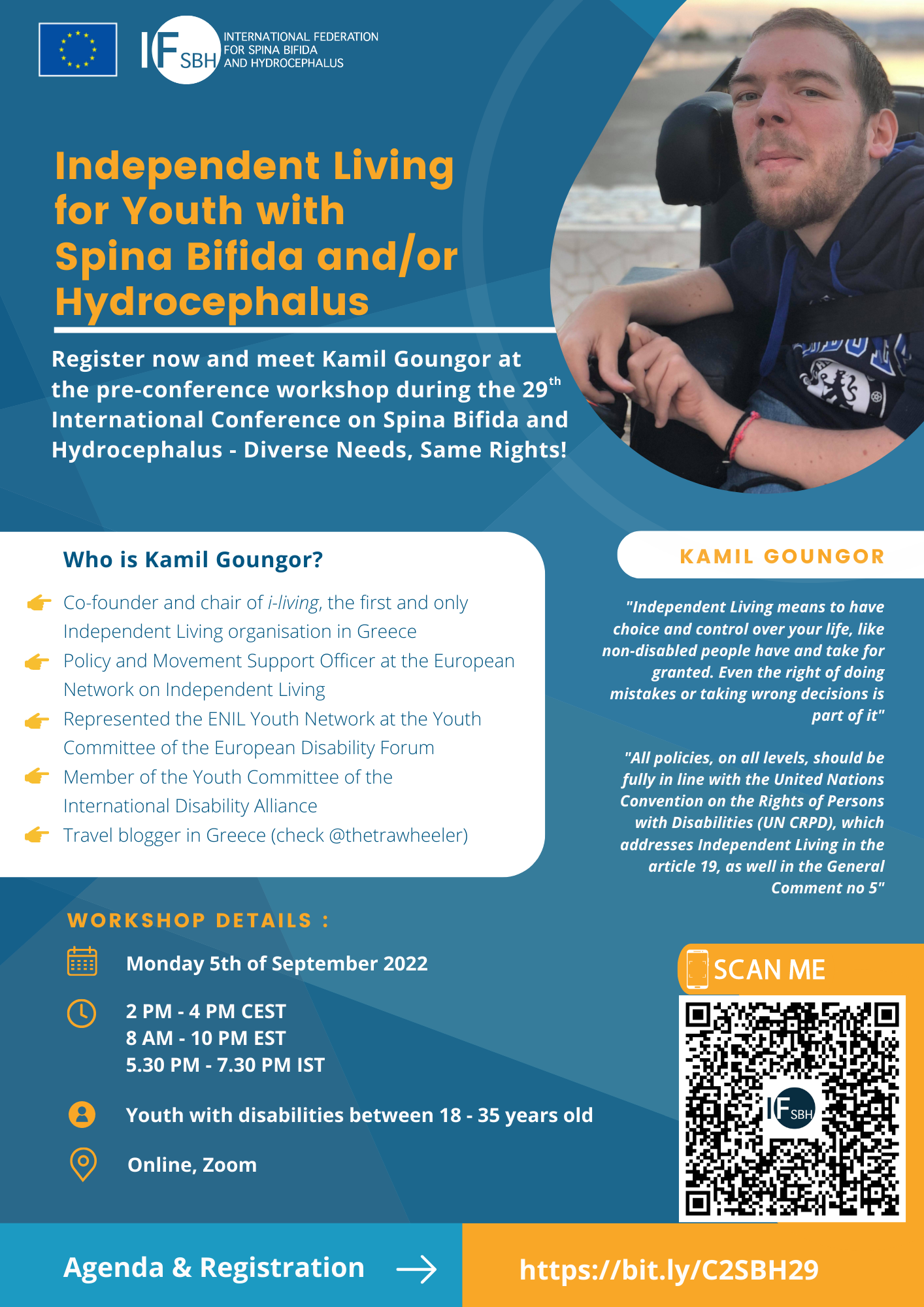 All youth with disabilities are welcome to the pre-conference workshop with Kamil Goungor (Policy and movement support officer at ENIL) that will take place during the 29th International Conference on Spina Bifida and Hydrocephalus – Diverse Needs, Same Rights.