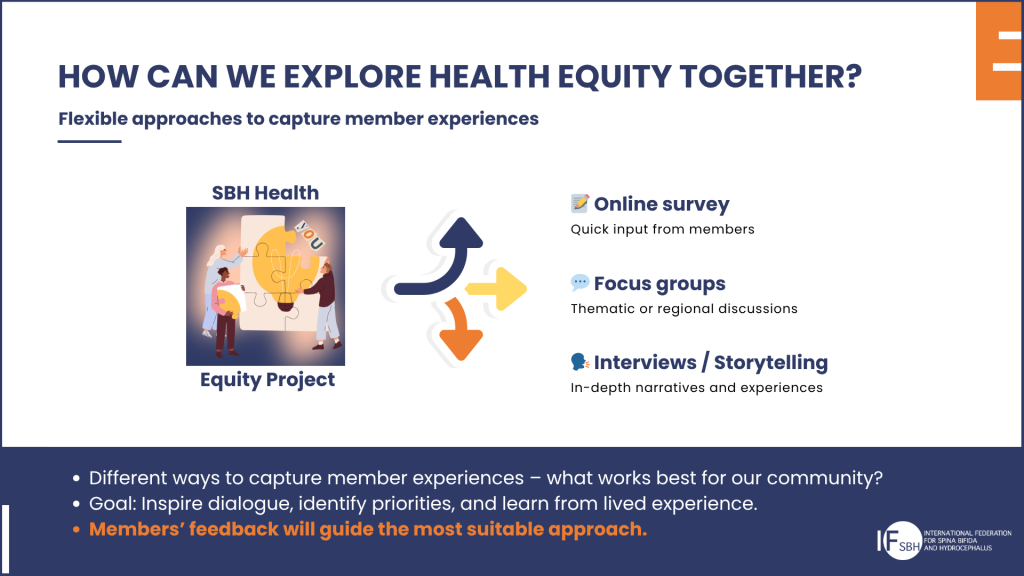 The Health Equity Project aims to better understand these realities through the voices of IF members and the wider SBH community. Rather than starting from scratch, it builds on existing knowledge and experience within the Federation, including previous publications, advocacy work, and engagement in global health initiatives such as the WHO Disability Health Equity Network.